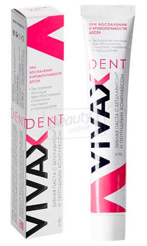 При стоматиті, гінгівіті, пародонтиті, у перед- та післяопераційному періодах при комплексному лікуванні пародонтиту. Зниження кровоточивості та набряклості ясен знімає запалення завдяки комплексному впливу пептидів тимусу (ПК-1), пептидів судин (ПК-7) та Бетулавіта® (екстракт берести берези). Пептиди судин значно прискорюють регенерацію та загоєння слизової оболонки порожнини рота та ясен, нормалізують обмінні процеси та мікроциркуляцію крові в тканинах пародонту. Пептиди тимусу активізують функції клітин сполучної тканини. Під впливом пептидів тимусу «VIVAX» стимулює локальний імунітет, і чинить антиоксидантну та антистресорну дію. Бетулавіт сприяє зменшенню рухливості зубів. Зубна паста «VIVAX» усуває гіперестезію емалі, пов'язану з пришийковим карієсом та некаріозними ураженнями зубів. Сприяє уповільненню прогресії рецесії ясен з оголенням шийок зубів при захворюваннях пародонту. Покращує мінеральний обмін у тканинах зубів: знижує ризик розвитку карієсу, зміцнює та захищає зубну емаль. Нейтралізує кислоту, що утворюється після прийому їжі, має виражену антибактеріальну дію. Ефективна при боротьбі з пародонтитом, стоматитом, галітозом (позбавляє неприємного запаху з рота). |